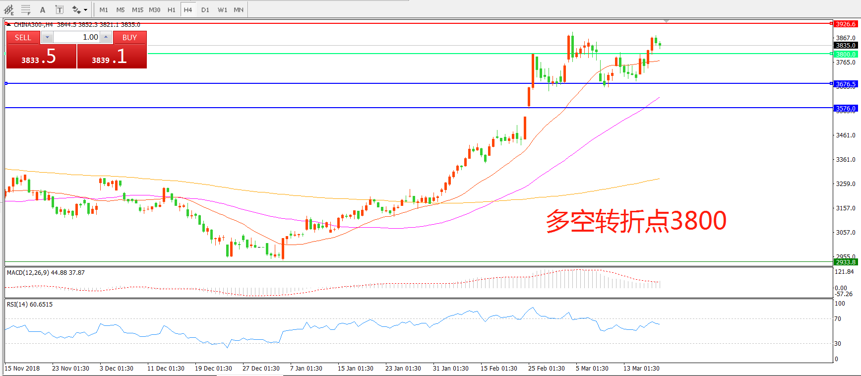 4小时图看,中华指数CHINA300中华指数连续上行,虽然今日小幅回落,但整体形态偏多,均线系统呈多头排列, MACD红柱增加,RSI指标拐头,日内延续上行概率较大。
