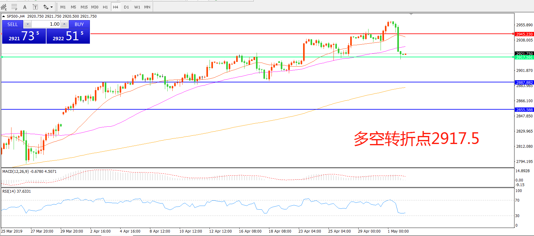 4小时图看,标普500整体呈现冲高回落走势, 暂时企稳于前期多空分水岭附近,短期均线有拐头迹象,MACD红柱缩短,日内重点关注2917.5一线得失。