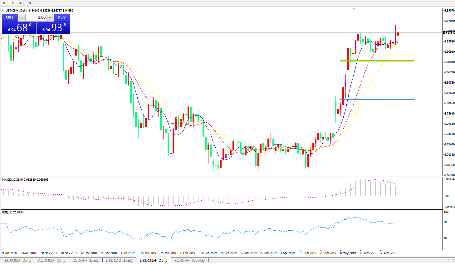 技术面简析:日线图均线整体维持攻势,MACD在0轴上方运行但动能柱轻微缩量,RSI超买区域附近运行,汇价强力上攻后宽幅强势整理,预计短期汇价有整理需求,中期重点关注中美贸易争端后续进展。