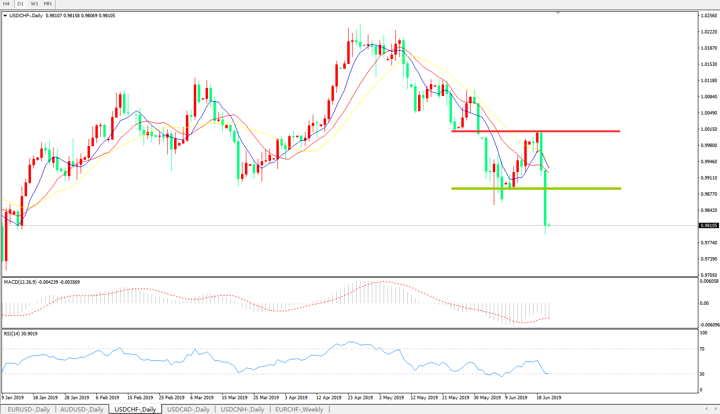 技术面简析:日线图均线再度空头排列,汇价暴跌击穿前低打开下行空间,MACD0轴下方运行且动能柱再度放量RSI逐步走低,预计汇价将进一步下行