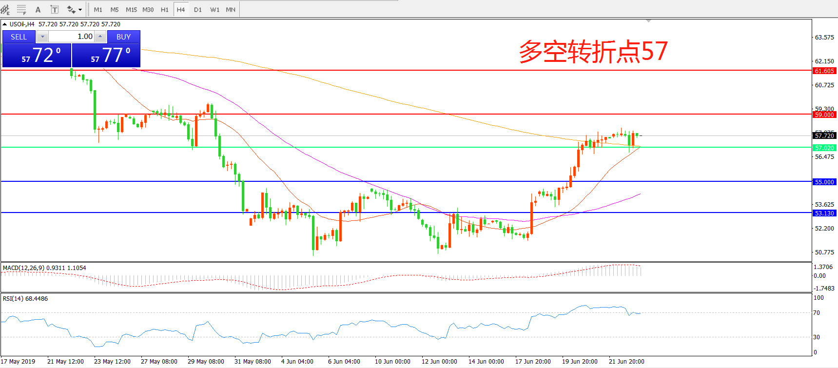 交易策略:在57.00之上看涨,目标59.00 61.50