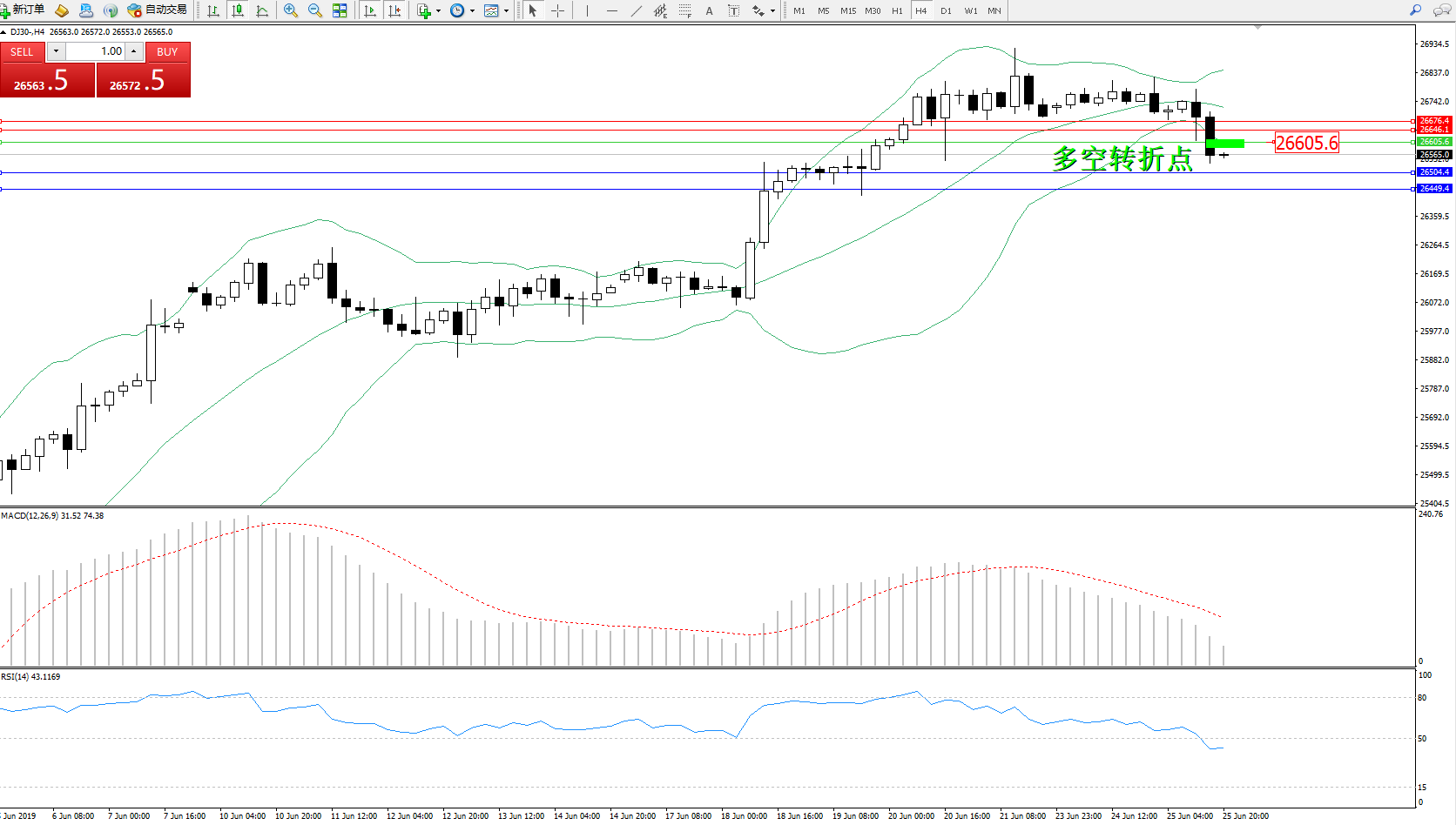 道琼斯指数DJ30—— 4小时K线图显示: