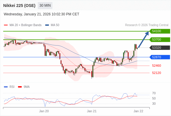 日经225股指期货 (OSE) 当日内: 在52870之上,看涨。