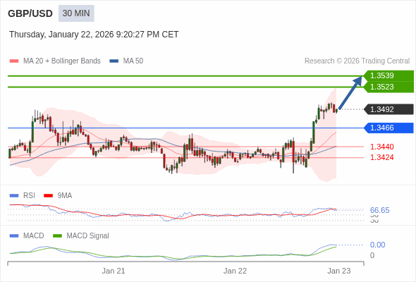 英镑/美元 当日内 : 看涨,当 1.3466 为支撑位。