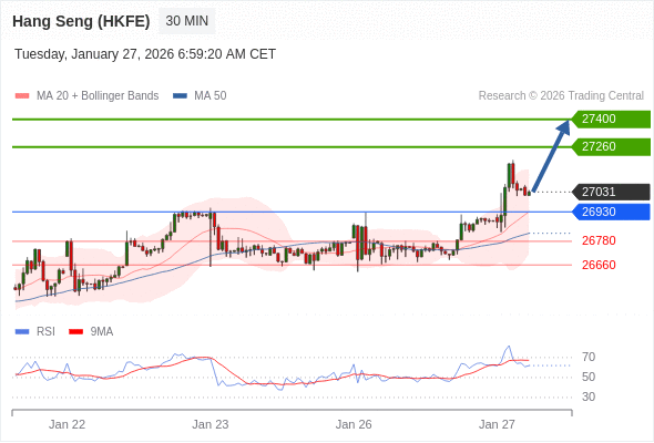 在 26930 之上,看涨,目标价位为 27260 ,然后为 27400 。