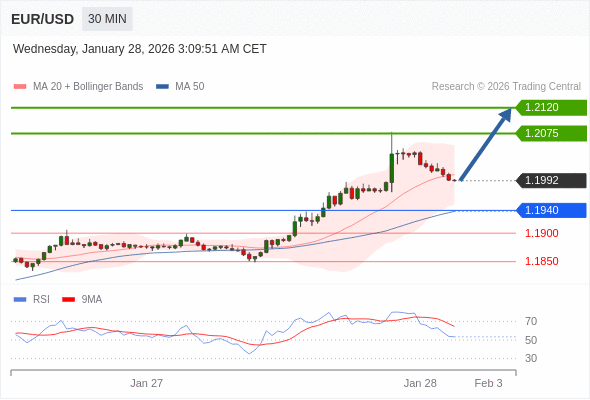 在 1.1940 之上,看涨,目标价位为 1.2075 ,然后为 1.2120 。