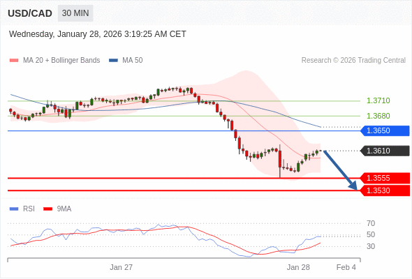 在 1.3650 之下,看跌,目标价位为 1.3555 ,然后为 1.3530 。