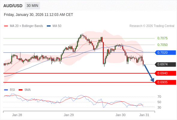 交易策略: 在 0.7020 之下,看跌,目标价位为 0.6940 ,然后为 0.6905 。