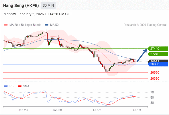 香港恒生指数期货 当日内: 超短线(当日内)支撑位在26860附近。