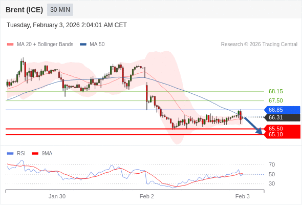 交易策略: 在 66.85 之下,看跌,目标价位为 65.50 ,然后为 65.10 。