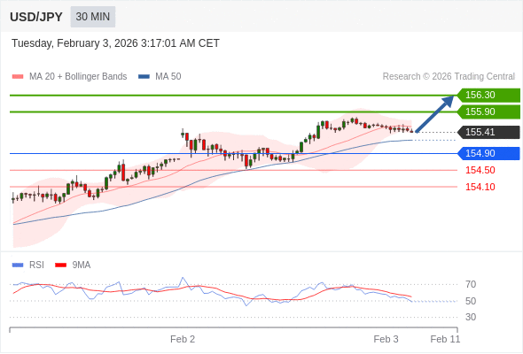在 154.90 之上,看涨,目标价位为 155.90 ,然后为 156.30 。
