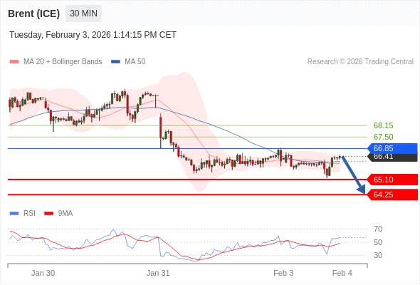 交易策略: 在 66.85 之下,看跌,目标价位为 65.10 ,然后为 64.25 。