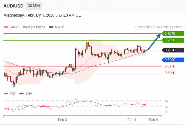 在 0.6990 之上,看涨,目标价位为 0.7050 ,然后为 0.7070 。