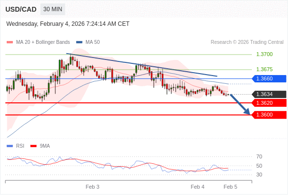 在 1.3660 之下,看跌,目标价位为 1.3620 ,然后为 1.3600 。
