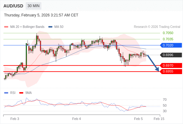 在 0.7020 之下,看跌,目标价位为 0.6970 ,然后为 0.6955 。