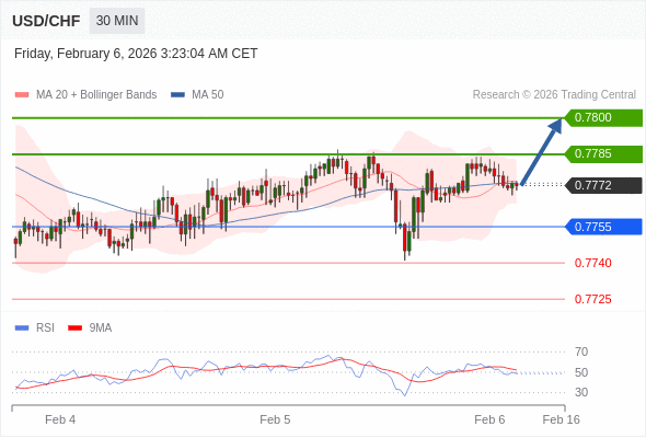 在 0.7755 之上,看涨,目标价位为 0.7785 ,然后为 0.7800 。