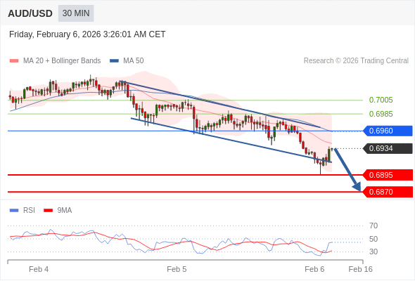 交易策略: 在 0.6960 之下,看跌,目标价位为 0.6895 ,然后为 0.6870 。