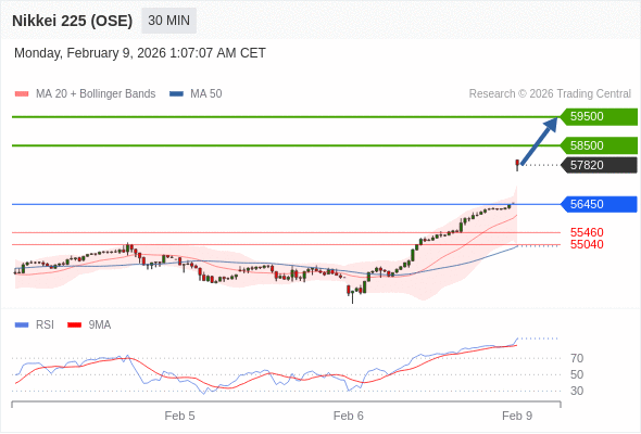 交易策略: 在 56450 之上,看涨,目标价位为 58500 ,然后为 59500 。
