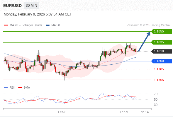 在 1.1800 之上,看涨,目标价位为 1.1835 ,然后为 1.1855 。