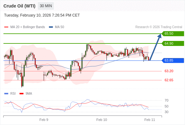 在 63.85 之上,看涨,目标价位为 64.90 ,然后为 65.50 。