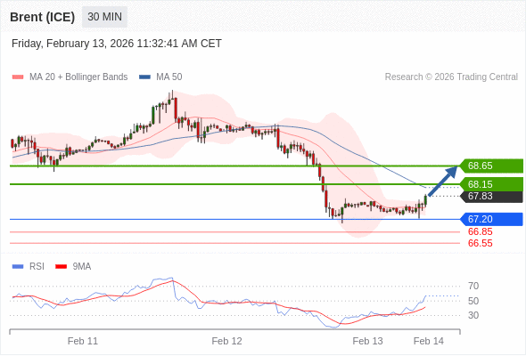 在 67.20 之上,看涨,目标价位为 68.15 ,然后为 68.65 。