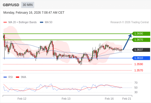 在 1.3610 之上,看涨,目标价位为 1.3670 ,然后为 1.3690 。