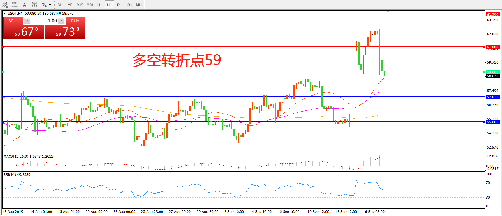 周二(9月17日)有消息指出,沙特接近恢复570万桶/日产量损失的70%,而沙特石油产量将在未来2-3周完全恢复,沙特原油产量恢复速度快于预期令多头信心严重受挫,美、布两油跌幅一度扩大至逾6%,美国鉴定出导弹在伊朗发射的位置,美国副总统彭斯即将前往沙特,原油自低位震荡反弹,最终美国WTI原油收跌5.7%,报58.78美元/桶。