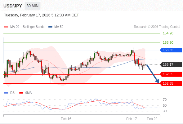 在 153.65 之下,看跌,目标价位为 152.85 ,然后为 152.55 。
