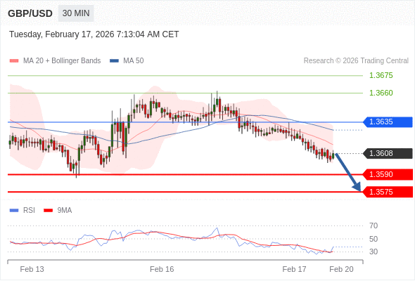 在 1.3635 之下,看跌,目标价位为 1.3590 ,然后为 1.3575 。