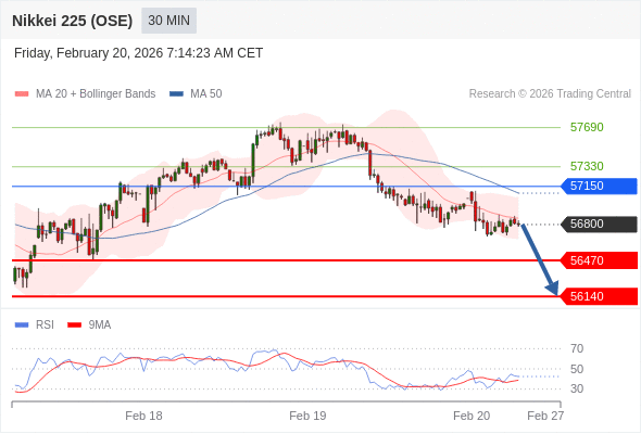 在 57150 之下,看跌,目标价位为 56470 ,然后为 56140 。