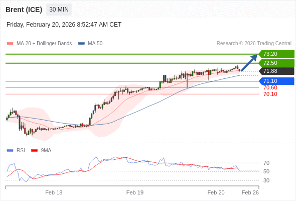在 71.10 之上,看涨,目标价位为 72.50 ,然后为 73.20 。