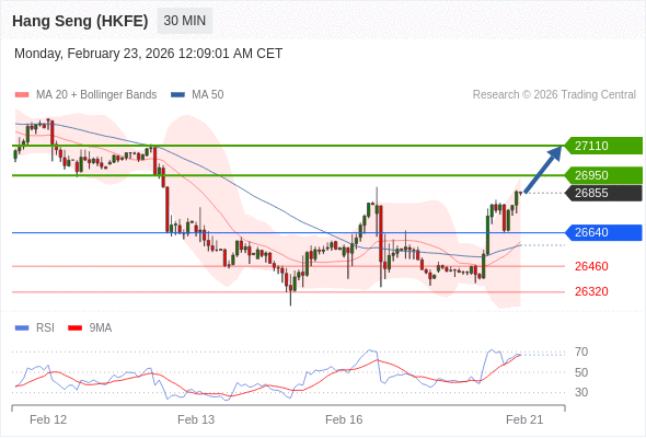 香港恒生指数期货 当日内: 进一步上涨。