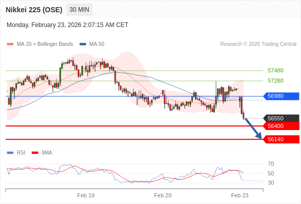 交易策略: 在 56980 之下,看跌,目标价位为 56400 ,然后为 56140 。