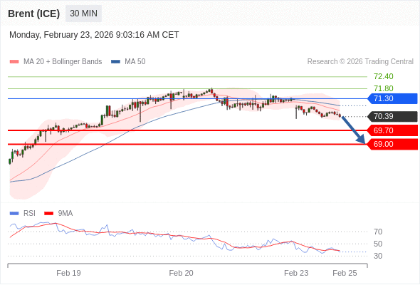 交易策略: 在 71.30 之下,看跌,目标价位为 69.70 ,然后为 69.00 。