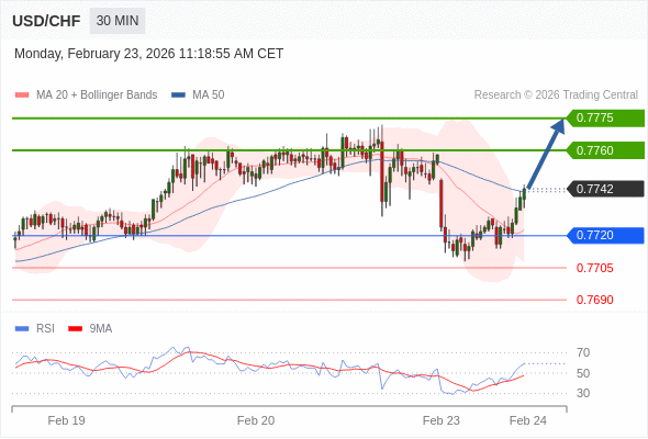 在 0.7720 之上,看涨,目标价位为 0.7760 ,然后为 0.7775 。