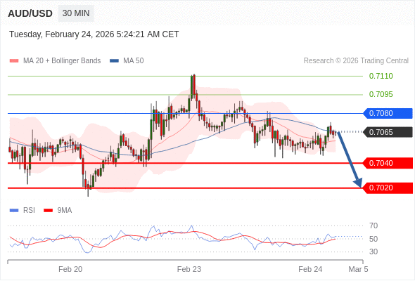 交易策略: 在 0.7080 之下,看跌,目标价位为 0.7040 ,然后为 0.7020 。
