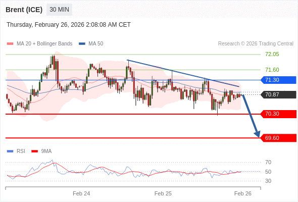 交易策略: 在 71.30 之下,看跌,目标价位为 70.30 ,然后为 69.60 。