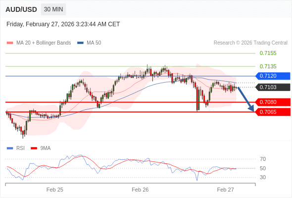 交易策略: 在 0.7120 之下,看跌,目标价位为 0.7080 ,然后为 0.7065 。