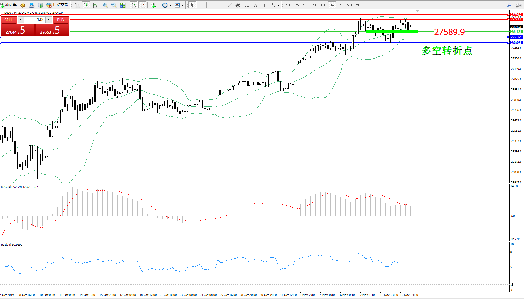 道琼斯指数DJ30—— 4小时K线图显示: