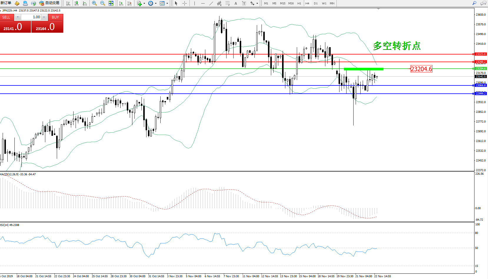 日经225指数1122日(周五)收盘上涨85.42点,涨幅0.37%,报23124.00点。日本发布PMI数据,显示日本PMI综合指数升至48.6,表明日本第四季度GDP收缩的可能性很大。由于增税的影响,日本的工业产出和零售额可能大幅下滑。通胀数据显示,本月销售税上调对物价影响不大,不太可能影响消费者支出。然而,核心通胀率仍远低于日本央行2%的目标。中央需要在较长时期内维持超宽松的货币政策。但即便如此,几乎没有证据表明,通过当前的刺激措施,通胀能够持续达到目标。