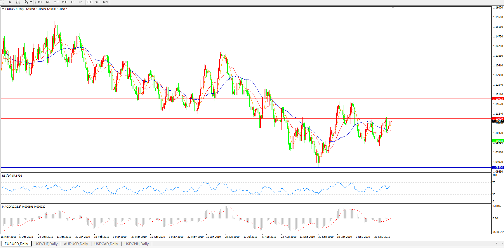 技术面简析:日图均线粘合有轻微上行迹象,汇价有再度冲击1.11关口压制的迹象,MACD逼近0轴且量能在0轴上方有放量迹象 ,RSI逐步走升,预计汇价将重回上攻态势。