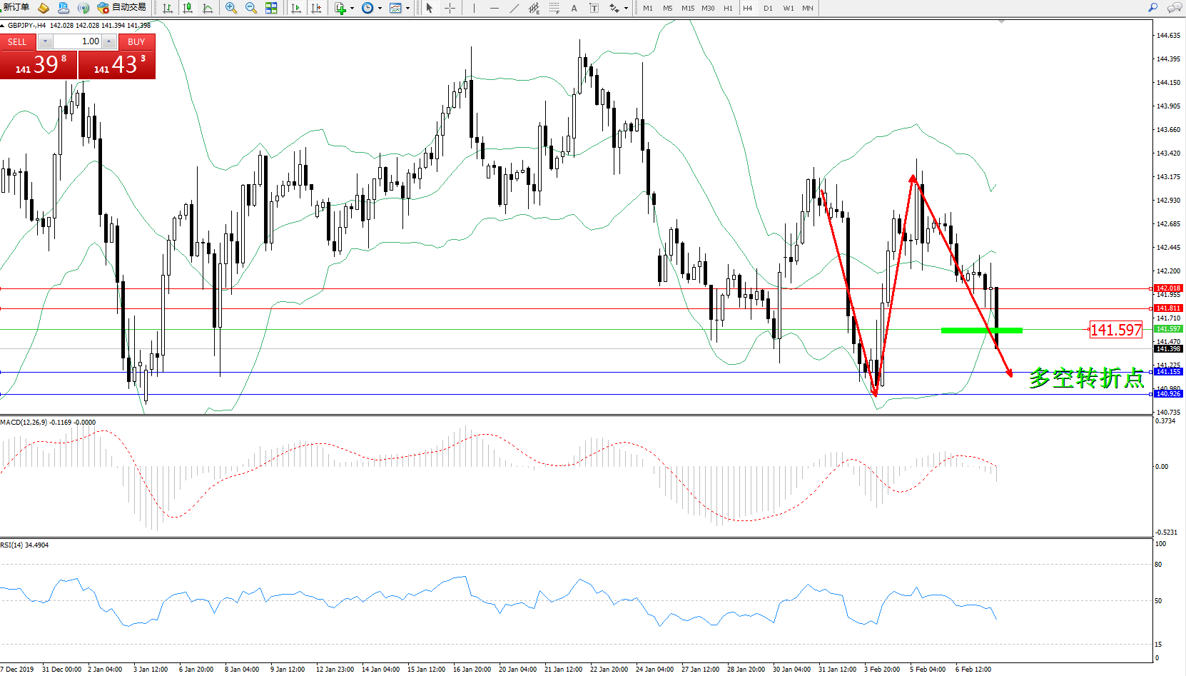 交易策略:141.597下方看跌,目标141.155140.926