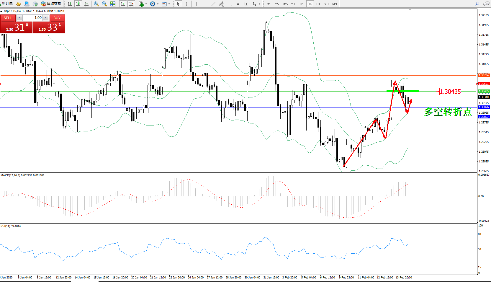 备选策略:1.30435上方看涨,目标1.306011.30794