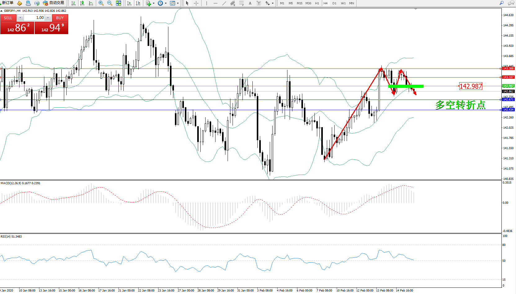 交易策略:142.987下方看跌,目标142.671142.434