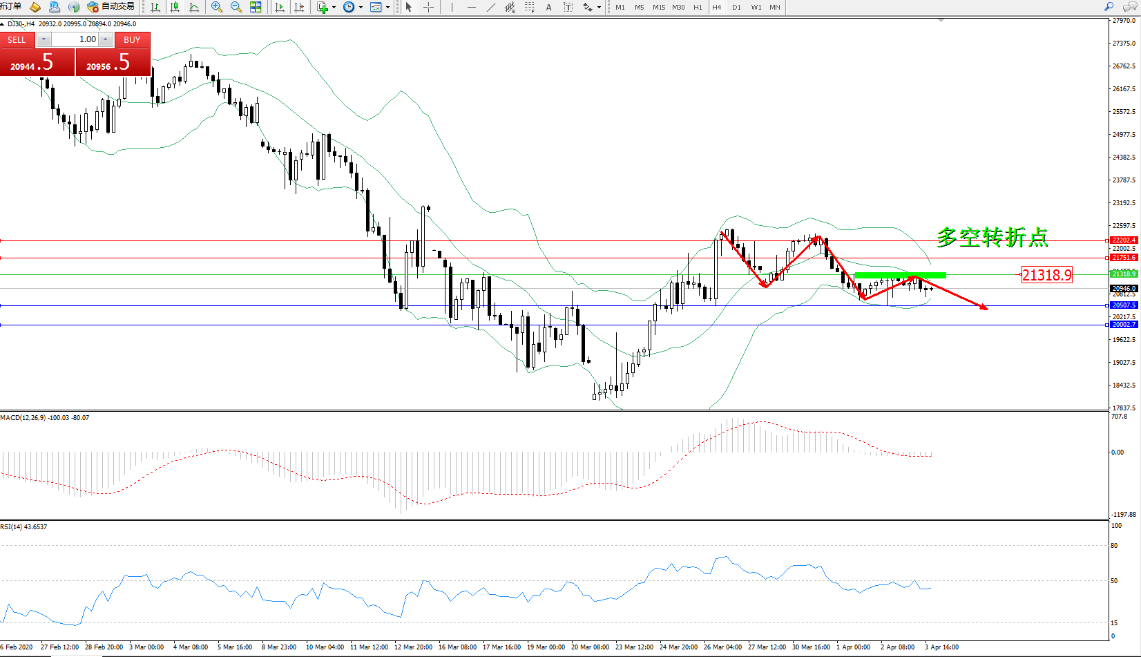 道琼斯指数DJ30—— 4小时K线图显示: