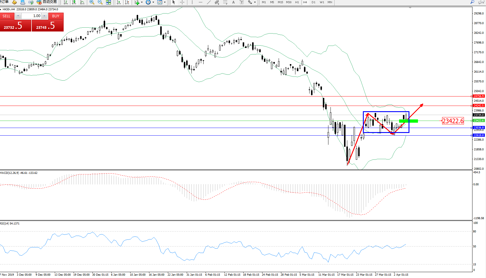 恒指HK50 ——4小时K线图显示: