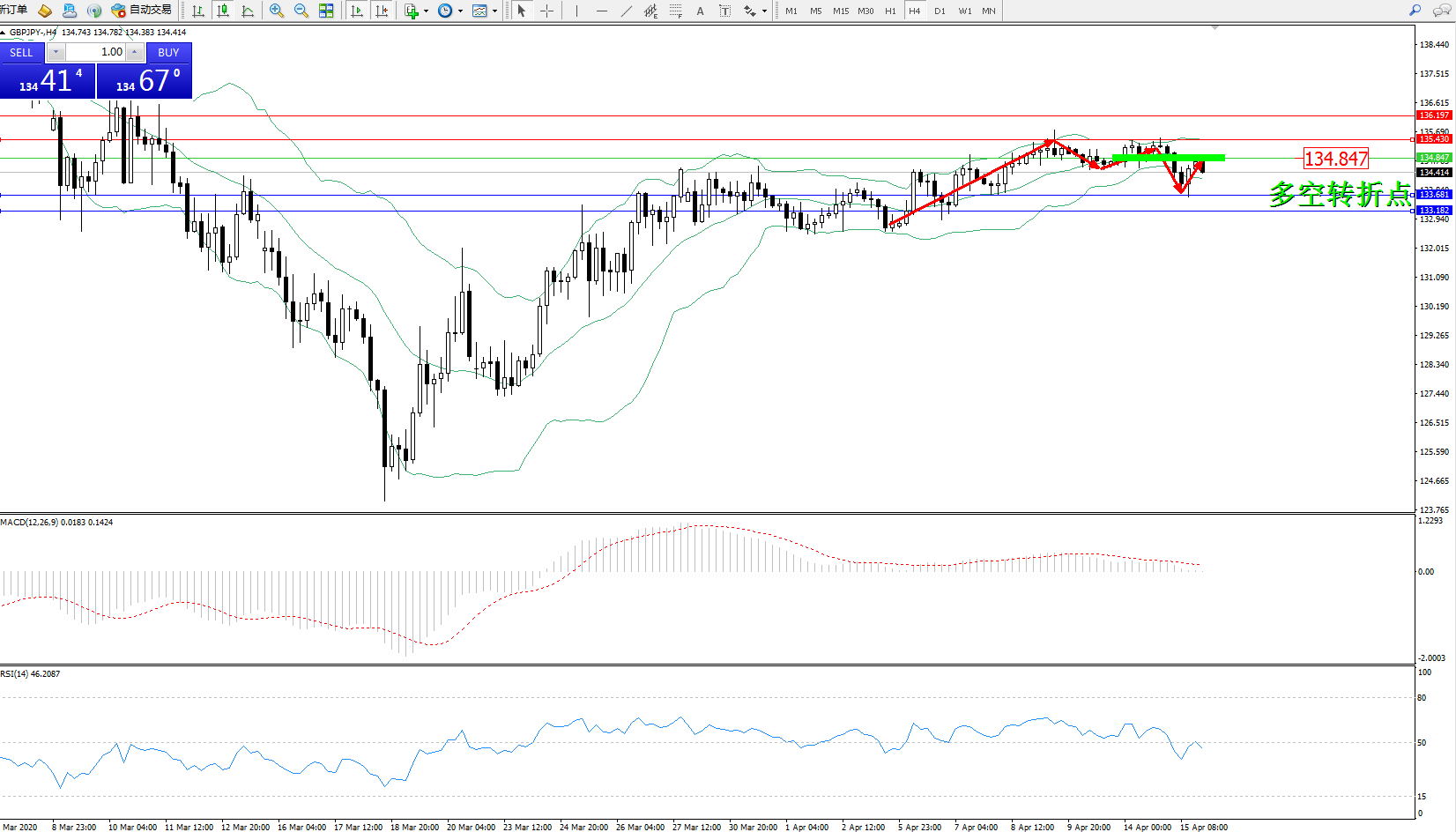 交易策略:134.847下方看跌,目标133.681133.182