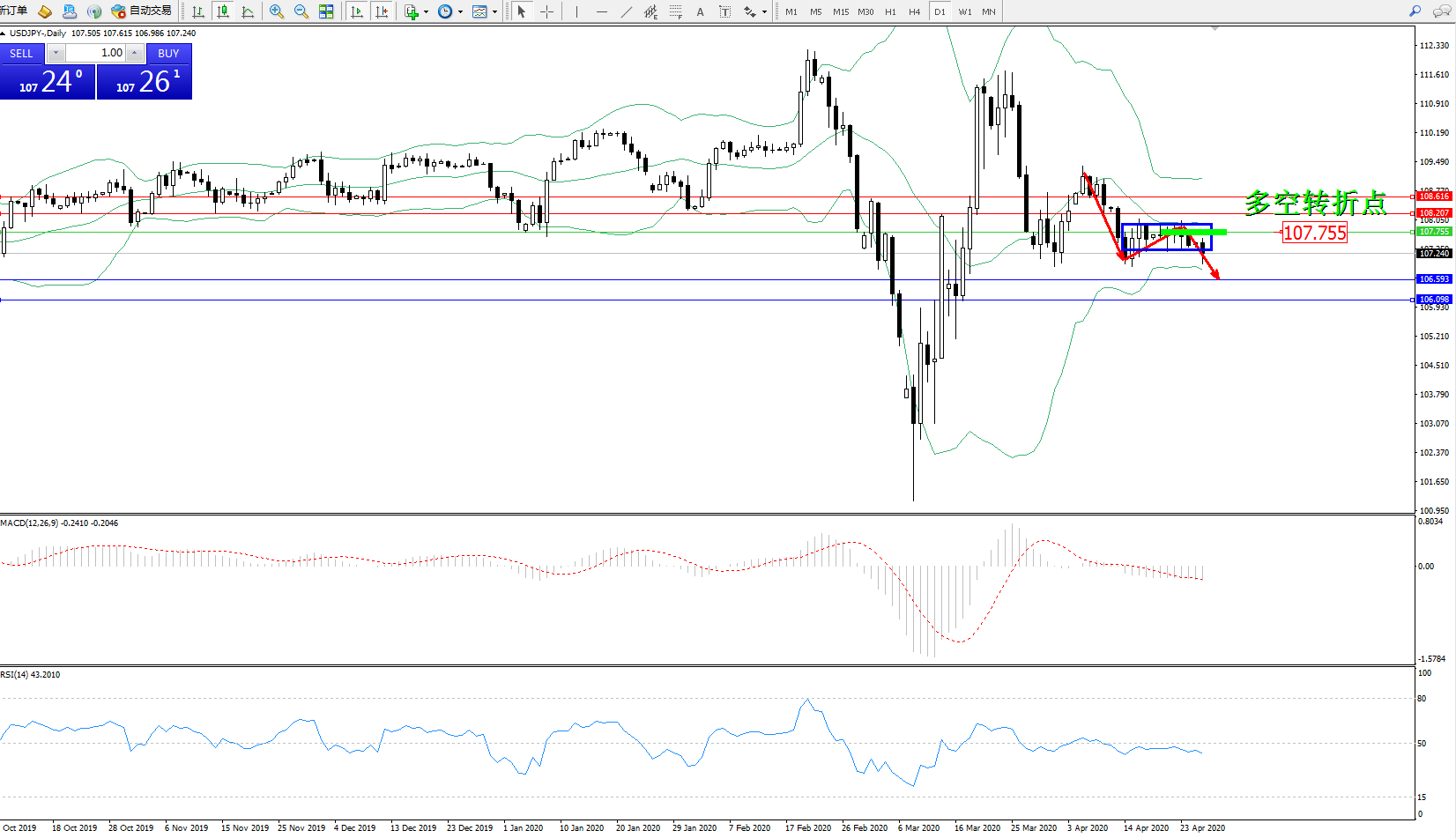 交易策略:107.755下方看跌,目标106.593106.098