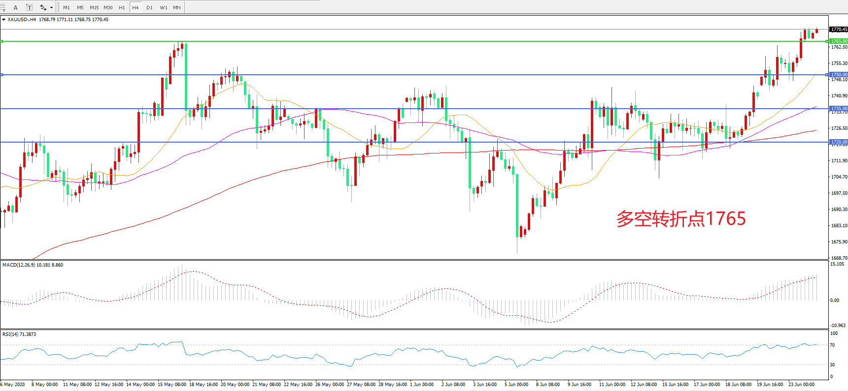 交易策略:在1765.00之上看涨,目标1780.00   1800.00