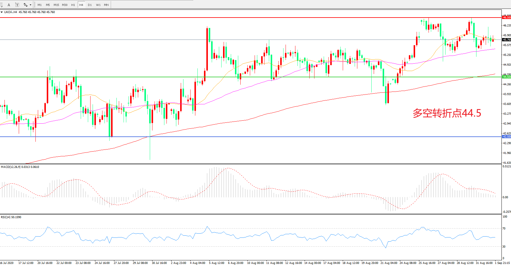 4小时图看,油价触及46.5一线后大幅回落,整体走势再度陷入分歧,55周期均线成为短期支撑,MACD红柱减少,RSI指标走平,日内延续震荡概率较大。
